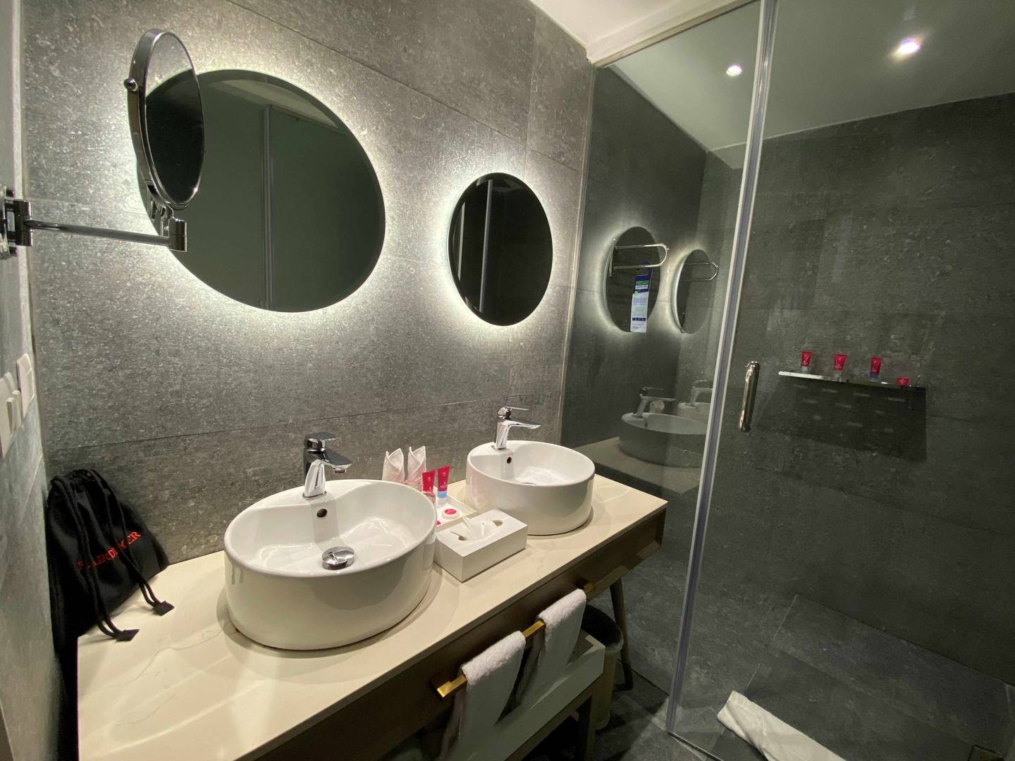 - Bathroom with shower and hairdryer